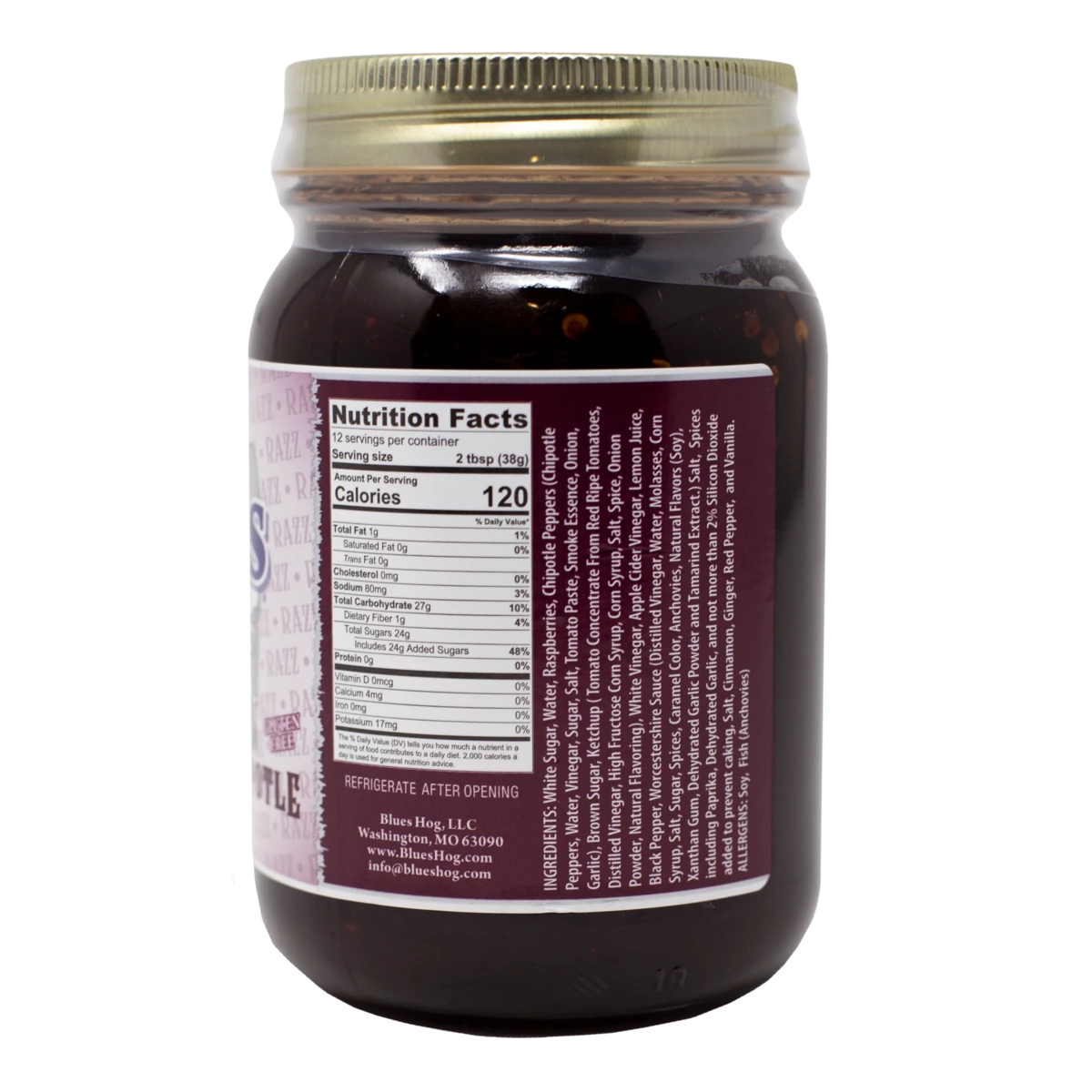 Ingrediënten: Witte suiker, water, frambozen, chipotle-pepers (chipotle-pepers, water, azijn, suiker, zout, tomatenpuree, rookextract, ui, knoflook), bruine suiker, ketchup (tomatenconcentraat van rode rijpe tomaten, gedistilleerde azijn, high fructose maïs siroop, zout, kruiden, uienpoeder, natuurlijke smaakstoffen), witte azijn, appelazijn, citroensap, zwarte peper, Worcestershire-saus (gedistilleerde azijn, water, melasse, glucosestroop, zout, suiker, kruiden, karamelkleur, ansjovis (vis), natuurlijke aroma’s (Soja) en Tamarinde-extract), zout, specerijen waaronder paprika, gedehydrateerde knoflook en niet meer dan 2% Siliciumdioxide toegevoegd om aankoeken te voorkomen, zout, kaneel, gember
